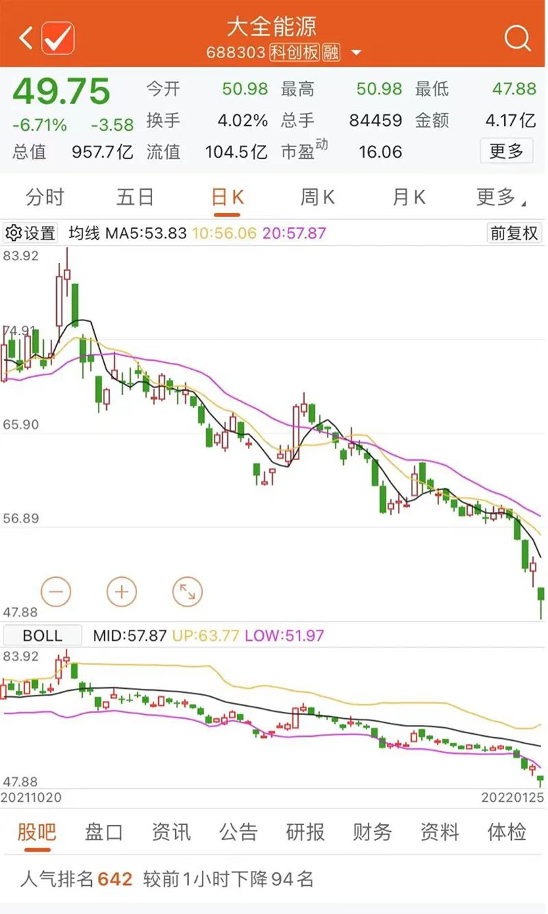 今日早盘,大全能源股价大幅低开后,低位震荡,截至午间收盘报49.75元/股,下跌6.71%。