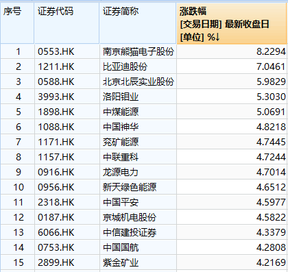 截至收盘,AH股中,南京熊猫电子股份涨8.23%,比亚迪涨7.05%,北京北辰实业股份涨5.98%,洛阳钼业涨5.30%,中煤能源涨5.06%,中国神华、兖矿能源、中联重科、龙源电力等均涨超4%。