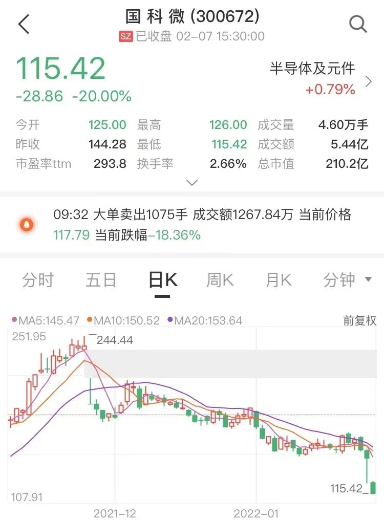 2月7日,国科微以20CM跌停收盘,封单余量1.62万手,全天成交额为5.44亿元。公司2021年业绩不达预期被认为是跌停的主要原因。