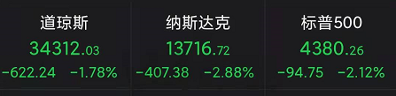 美股三大指数大跌。道指跌1.78%,报34312.03点,标普500指数跌2.12%,报4380.26点,纳指跌2.88%,报13716.72点。
