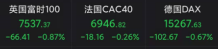 欧洲三大股指下跌。英国富时100指数跌0.87%报7537.37点;法国CAC40指数跌0.26%报6946.82点;德国DAX指数跌0.67%报15267.63点。