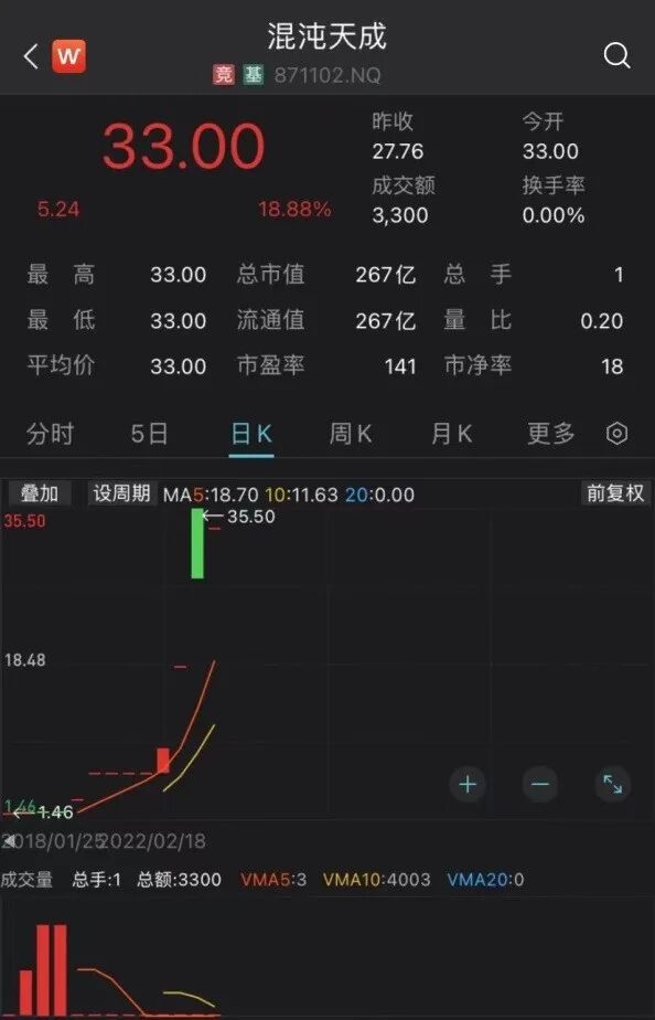 有分析人士指出,混沌天成股价异常波动主要是市场行为。新三板公司流动性较弱,很小的交易量就有可能引发股价的大幅波动。比如,2月18日,混沌天成股价大涨18.88%,但成交量仅100股,成交额仅3300元。