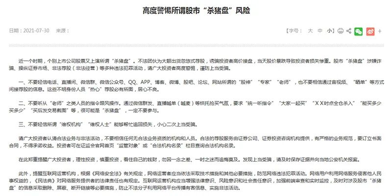 2021年7月,中国证监会发布《高度警惕所谓股市“杀猪盘”风险》一文,指出不法团伙为大额出货忽悠式荐股,诱骗投资者高价接盘,随后股价暴跌导致投资者损失惨重。股市“杀猪盘”涉嫌诈骗、操纵证券市场、非法荐股(非法经营)等多种违法犯罪活动,请广大投资者高度警惕,谨防上当受骗。