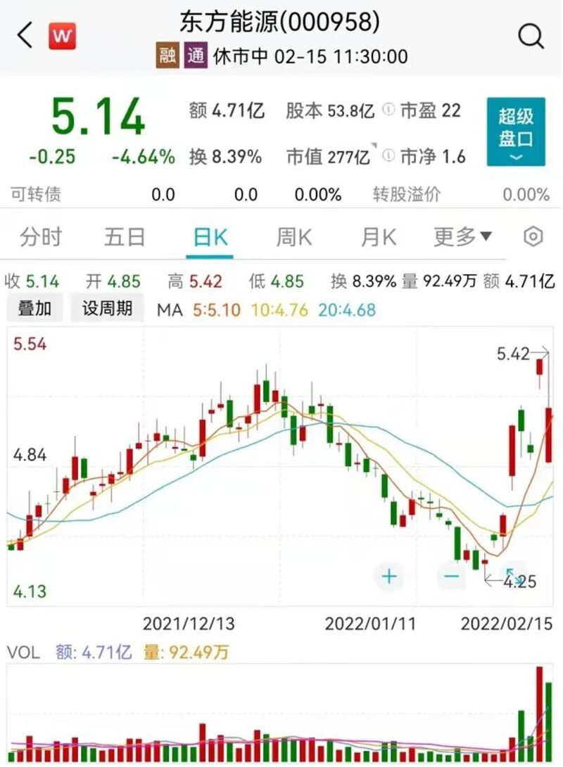 如某抖音号同样在2月12日表示,“铁铬液流电池性能吊打锂电”“整个市场拥有(铁铬液流电池)核心工艺的企业只有两家,其中一家是两市为数不多具有国资背景的能源企业,目前股价不足五元,后市值得高看一眼”。上述特征与东方能源十分吻合。
