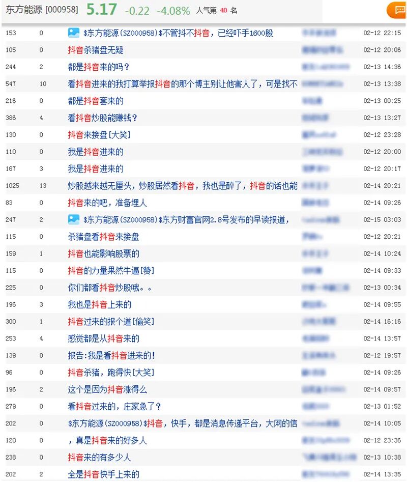 翻阅东方能源股吧,不少投资者均表示,“我是抖音进来的”“抖音过来的报个到”“全是抖音快手上来的”。显然,所谓“大V”的集中荐股吸引了不少投资者跟风买入,社交软件对个股的影响力不容小觑。
