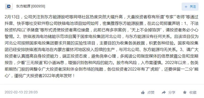 2月13日晚间,东方能源方面通过深交所互动平台发声,表示公司关注到东方能源股吧等网络社区热度突然大幅升高,大量投资者称有所谓“专家”“老师”等通过抖音、快手等社交软件称公司铁铬电池项目如何如何,密集推荐东方能源股票。对此,公司郑重声明: