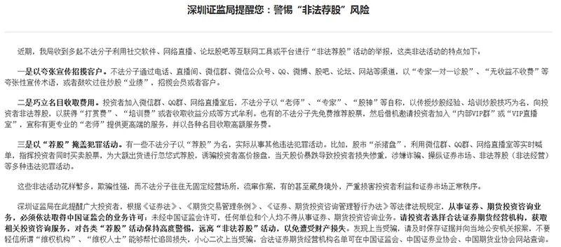如深圳证监局表示,已收到多起不法分子利用社交软件、网络直播、论坛股吧等互联网工具或平台进行“非法荐股”活动的举报,这类非法活动的特点如下: