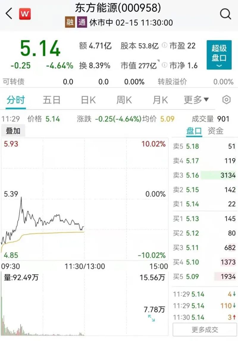 随着上市公司澄清声明的扩散,东方能源股价出现巨震。今日开盘集合竞价,东方能源股价一度触及跌停。截至午间收盘,东方能源股价报5.14元/股,下跌4.64%,昨日追高筹码多数“被套”。
