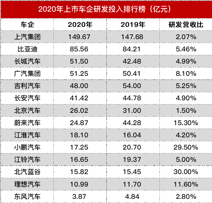 其他传统车企在研发上的投入也不低。2020年,长城汽车、长安汽车、吉利汽车等传统车企的研发投入均超过40亿元。