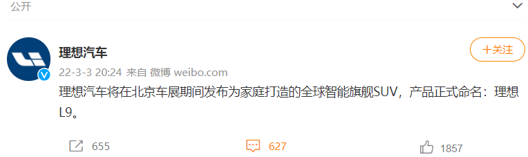理想汽车官微日前宣布,新车型L9将在第二季度发布。这是自理想ONE上市后,时隔3年,理想推出的第二款新车型。