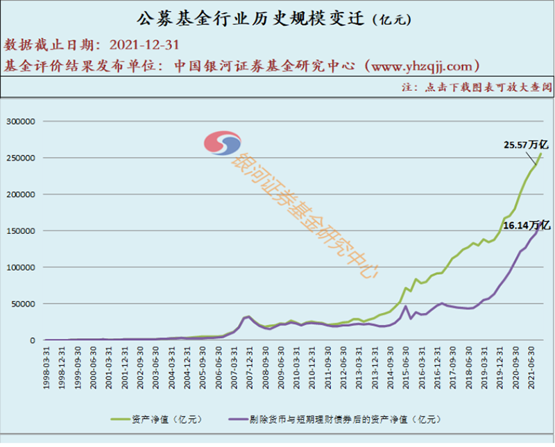 中国银河证券基金研究中心表示,从1998年末的100亿人民币到2021年四季度末的25.57万亿人民币,公募基金行业过去23年规模大幅度增长,充分体现了公募基金的专业价值。