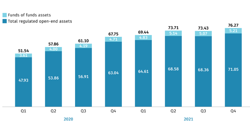 根据美国投资公司协会最新公布数据,截至2021年年底,全球受监管的开放式共同基金总规模为71.05万亿美元,折合人民币约为452.86万亿元。可以看到,全球开放式共同基金规模自2020年以来一直呈现稳步增长。