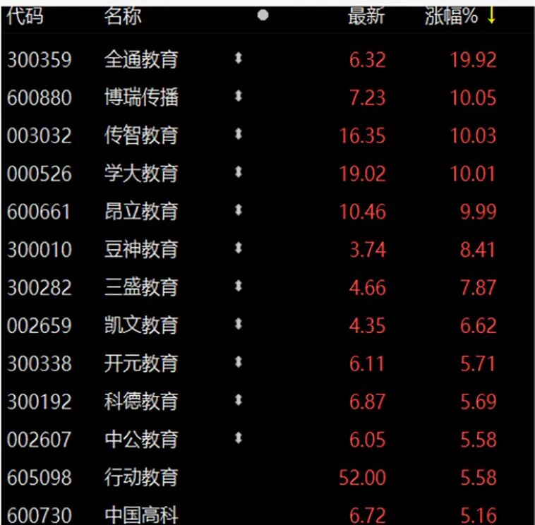 此外,博瑞传播、传智教育、学大教育、昂立教育涨停,豆神教育、开元教育、三盛教育、科德教育等涨幅居前。