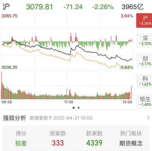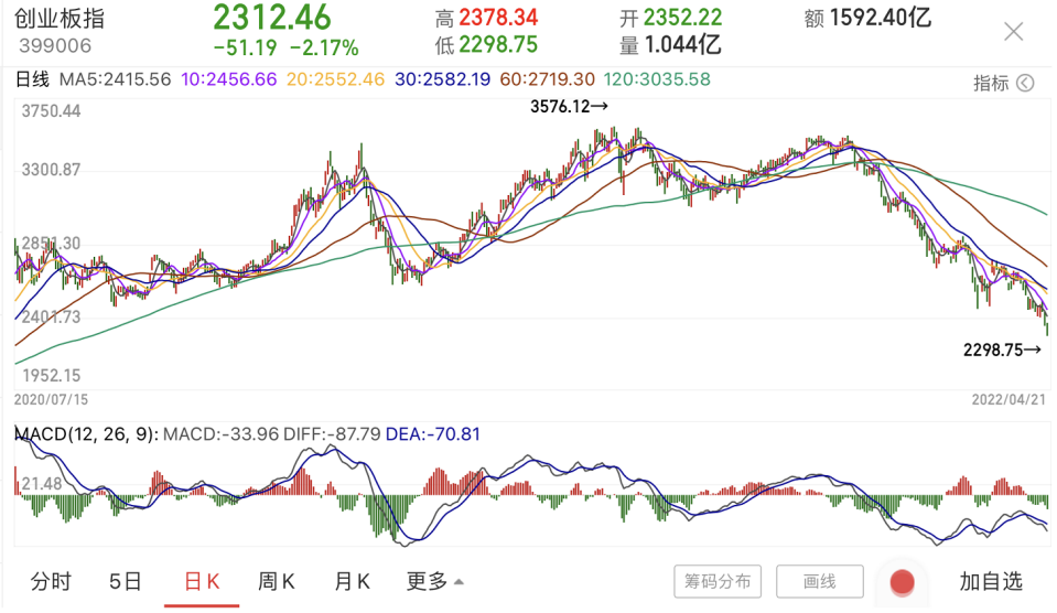 截至4月21日收盘,沪指跌2.26%报3079.81点,深成指跌2.7%报11084.28点,创业板指跌2.17%报2312.46点。创业板指跌出2020年中旬以来的指数新低。