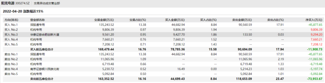 值得注意的是,阳光电源股价在4月以来的累计跌幅超过40%。4月20日的交易异动龙虎榜数据显示,多家机构交易席位在阳光电源中活跃。