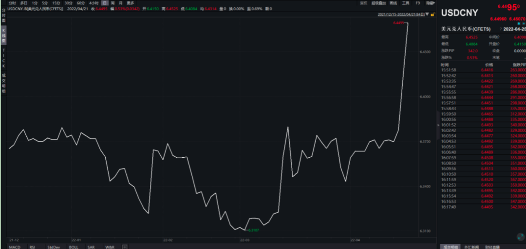 有观点认为,外汇市场波动是近期对A股市场影响较大的因素之一。截至4月21日发稿前,美元对人民币汇率报6.4495,人民币对美元连续3个交易日贬值。