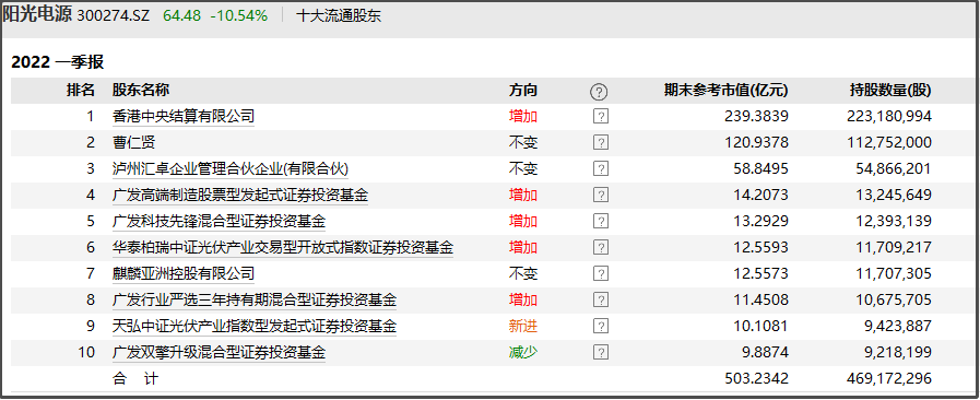 截至一季度末,广发基金旗下顶流基金经理增持了阳光电源,其中刘格菘管理的广发科技先锋、广发行业严选三年、广发双擎升级共计持股数量超3000万股,期末参考市值约合35亿元;郑澄然管理的广发高端制造入列阳光电源的第四大流通股东,持股数量为1324.56万股,期末参考市值约合13亿元。