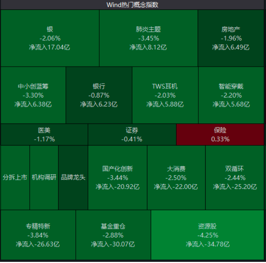 盘面上看,今日两市板块几乎全线飘绿,Wind热门概念指数中仅保险指数板块飘红,前期热门概念旅游、酒店餐饮、农业、房地产、物流、新零售、医药等板块全线熄火。