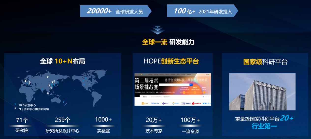 2009年,海尔自主构建开放创新平台HOPE,经过十余年的发展,在全球建立了10+N的科技创新生态,覆盖五大洲20多个国家和地区,链接了20万以上的全球专家和100余个一流资源,面向智慧家庭、大健康、工业互联网、智慧城市等领域的研发课题,汇聚全球智慧对接用户需求,不仅可以实现24小时不间断创新,还显著缩短了产品研发周期。