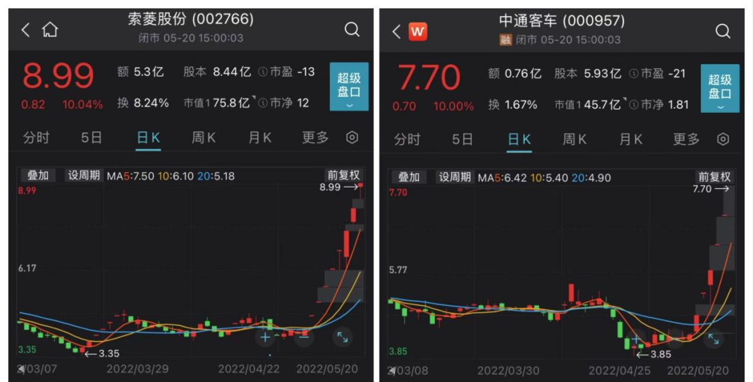 近期汽车板块持续上涨,5月份以来申万一级汽车行业指数已累计上涨14.10%,领涨申万一级行业。板块内更是诞生两只近期市场大牛股,分别是索菱股份和中通客车。