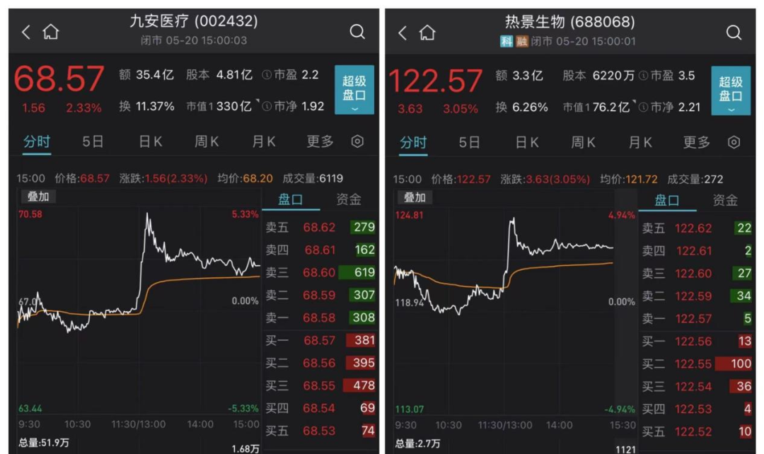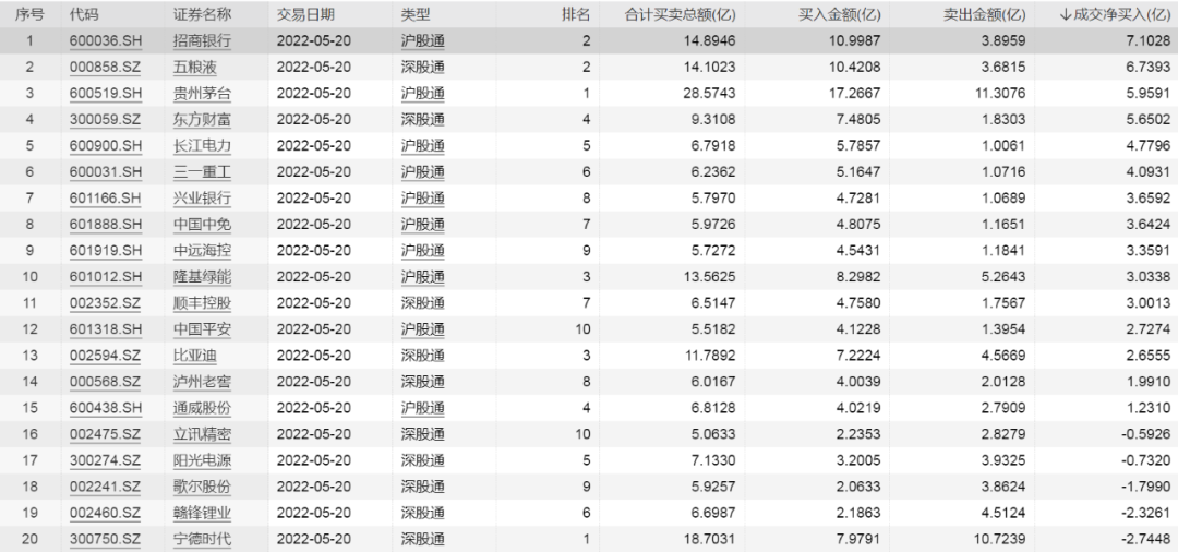 资金面上,Wind数据显示,今日北向资金净流入142.36亿元,创2021年12月9日以来新高,其中沪股通资金净流入103.74亿元,深股通资金净流入38.62亿元。截至5月20日收盘,A股总市值为83.43万亿元,较前一交易日增加1.35万亿元。