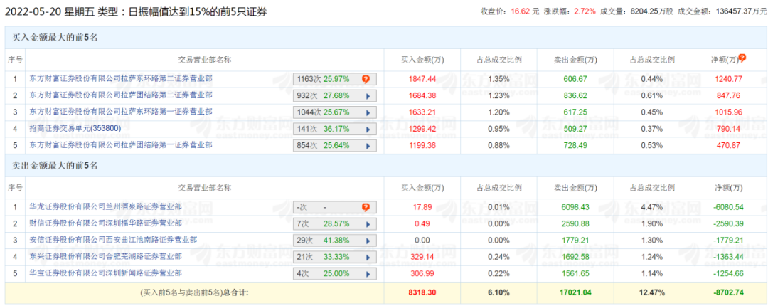 从甘咨询今日龙虎榜情况来看,买入前五席位中,除买四为招商证券交易单元外,其他四个席位均为有着“散户大本营”之称的东方财富证券拉萨的几个营业部席位,而卖出席位中,华龙证券兰州酒泉路证券营业部净卖出超6000万元,财信证券深圳福华路证券营业部净卖出超2500万元。
