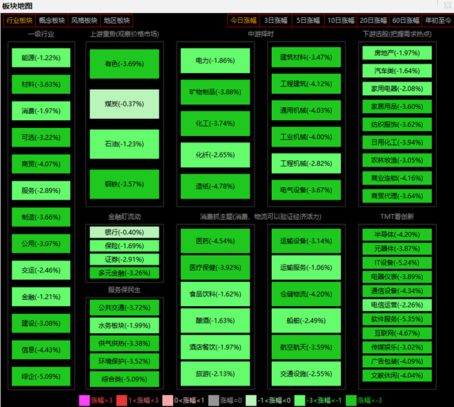 盘面上,各大板块全线下跌,新冠药、东数西算、数字经济等板块跌幅居前,煤炭相关板块跌幅较小。