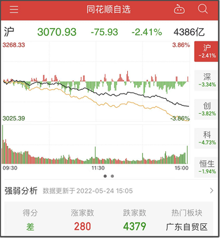 5月24日,A股全天震荡下跌,三大指数均跌超2%,创业板指领跌。截至收盘,沪指跌2.41%,深成指跌3.34%,创业板指跌3.82%。