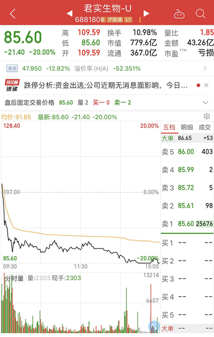 但似乎市场对君实生物的“利好”并不买账,资金挤兑出逃。