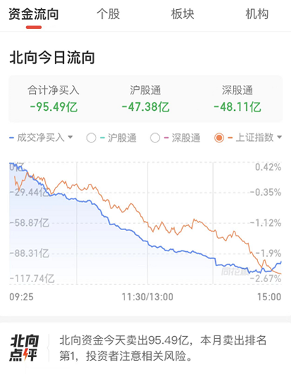总体上,个股跌多涨少,两市超4300只个股下跌,上涨个股不足300只。沪深两市今日成交额9904亿元,较上个交易日放量1307亿元。北向资金全天净卖出95.49亿元,创本月最高单日流出额,其中沪股通净卖出47.38亿元,深股通净卖出48.11亿元。