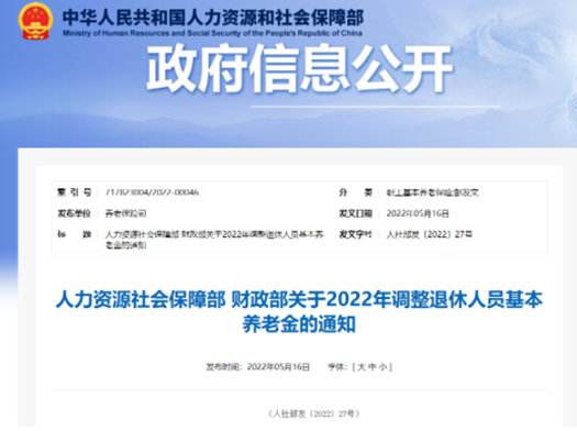 5月26日,人力资源社会保障部、财政部近日印发《关于2022年调整退休人员基本养老金的通知》。通知明确,从2022年1月1日起,为2021年底前已按规定办理退休手续并按月领取基本养老金的企业和机关事业单位退休人员提高基本养老金水平,总体调整水平为2021年退休人员月人均基本养老金的4%。