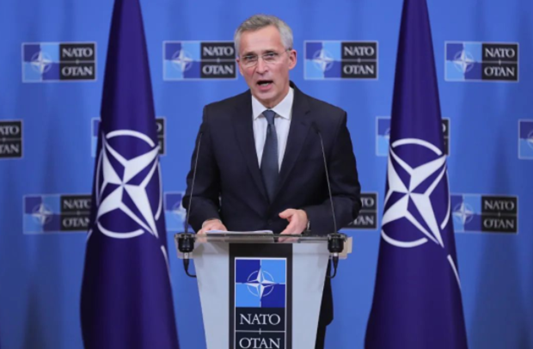 2月24日,北约秘书长斯托尔滕贝格在比利时布鲁塞尔的北约总部出席记者会。