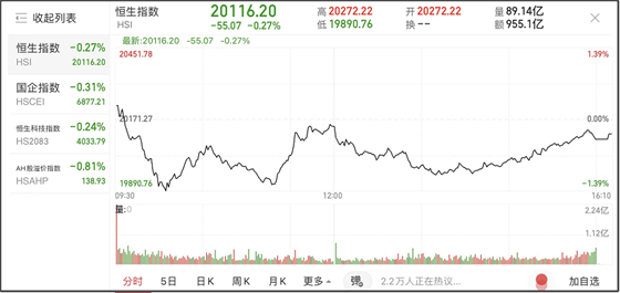 恒指收跌0.27% 成交额不足千亿