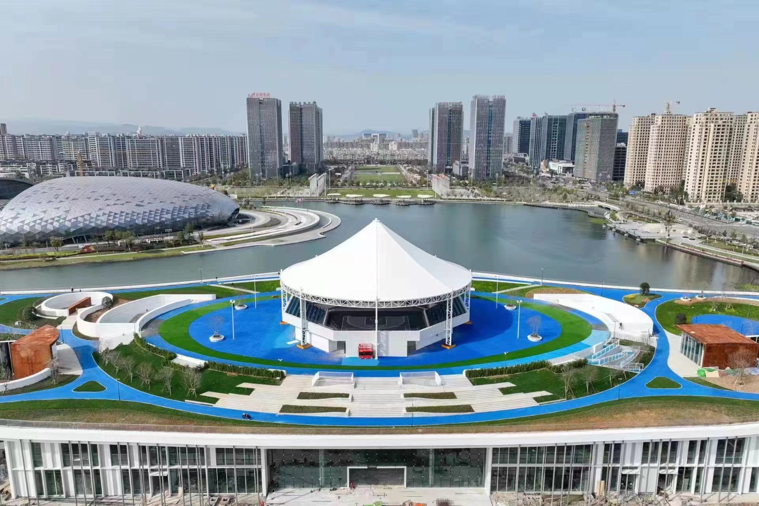 作为杭州亚运会三人篮球的比赛场地,湖州德清地理信息小镇三人篮球场位于德清县地理信息小镇,整个运动中心总面积36330平方米,总建筑面积5万平方米,为两层钢结构地景建筑,其中三人篮球场位于运动中心顶部,设计座位1000座。场馆内设有观众活动区、比赛场地区(FOP区)、体育竞赛区、电视转播区、媒体运行区、场馆礼宾区、场馆运行区、安保及交通运行区等功能区块,还安装有20只强指向性扬声器、82台体育建筑专用LED节能照明灯具等,能够最大限度满足电视转播要求和观众体验感。