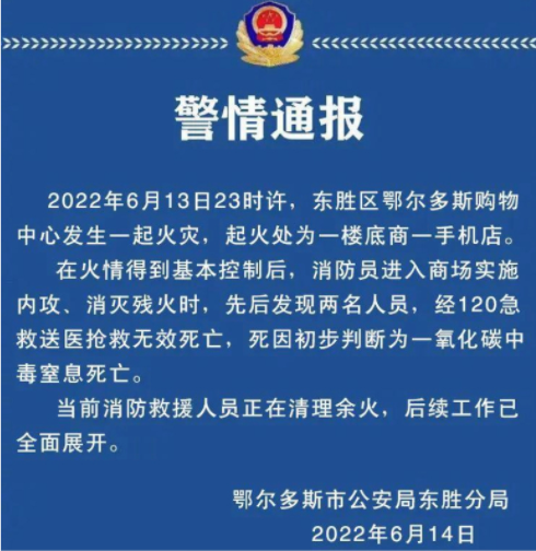 鄂尔多斯市公安局东胜分局6月14日发布警情通报称,2022年6月13日23时许,东胜区鄂尔多斯购物中心发生一起火灾,起火处为一楼底商一手机店。在火情得到基本控制后,消防员进入商场先后发现两名人员,经120急救送医抢救无效死亡,死因初步判断为一氧化碳中毒窒息死亡。