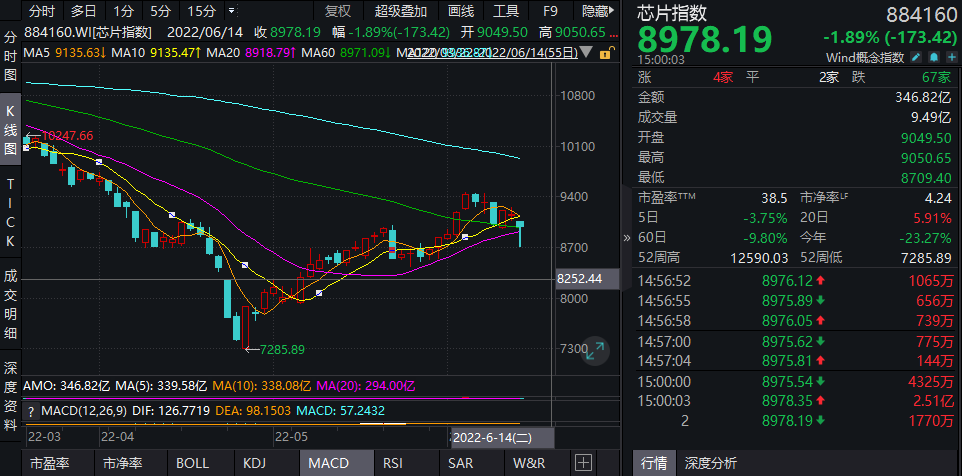 Wind芯片指数显示,指数成分股中67只个股下跌,仅4只个股上涨,指数跌幅为1.89%。