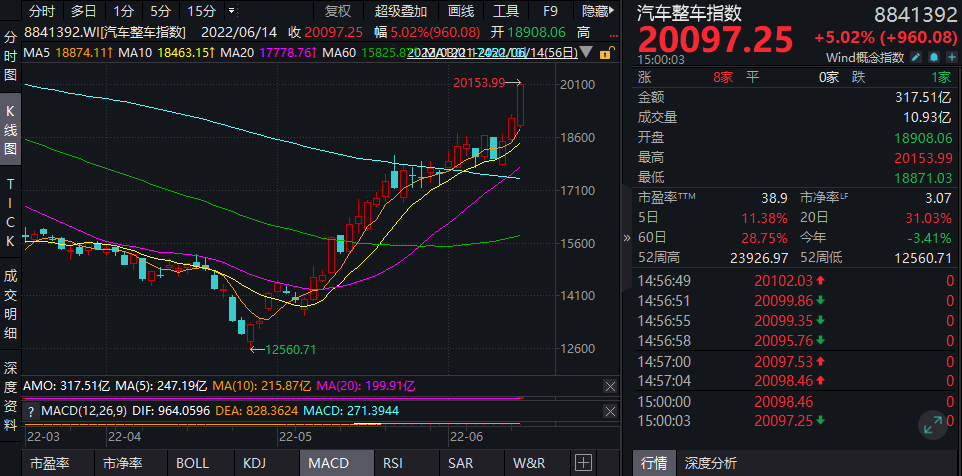 汽车相关概念股继续表现强势,长安汽车、一汽解放,北汽蓝谷涨停。Wind汽车整车指数上涨5.02%。自4月底以来,该指数累计涨幅超过50%,为近期表现最为活跃的板块之一。