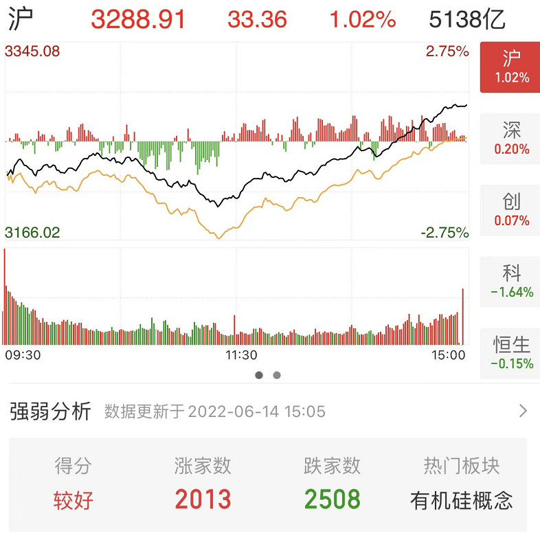 6月14日,受外围大跌影响,A股三大指数低开低走,临近午盘指数开始探底回升。截至收盘,沪指涨1.02%,深成指涨0.2%,创业板指涨0.07%。