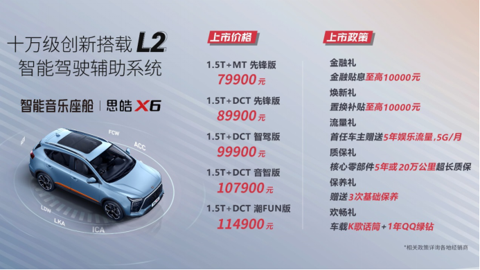 思皓X6定位为家用紧凑型智能音乐SUV,车长4505mm,轴距2660mm,搭载二代1.5T涡轮增压发动机和湿式双离合变速器,最新一代飞鱼OS智能车联网系统,全车布置11个高品质扬声器,拥有智能辅助驾驶安全配置。
