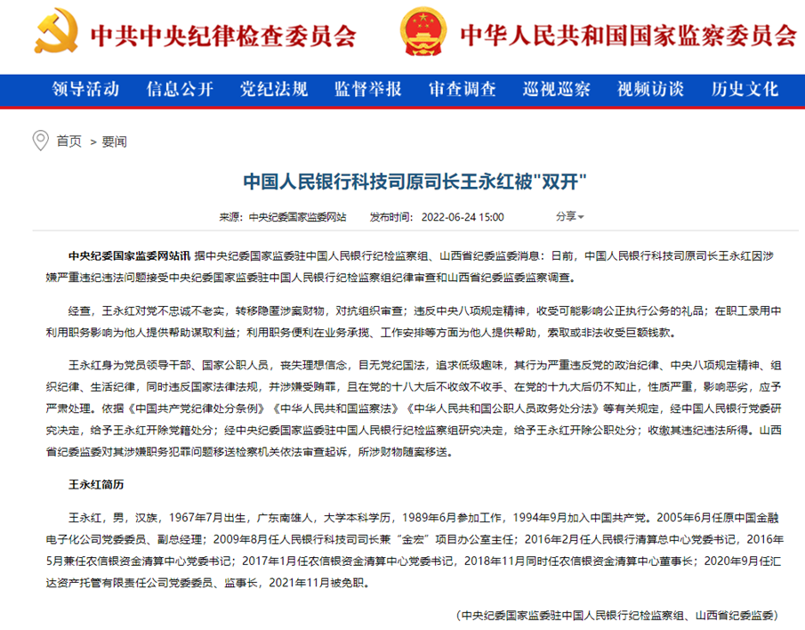 中央纪委国家监委网站6月24日通报,据中央纪委国家监委驻中国人民银行纪检监察组、山西省纪委监委消息:日前,中国人民银行科技司原司长王永红因涉嫌严重违纪违法问题接受中央纪委国家监委驻中国人民银行纪检监察组纪律审查和山西省纪委监委监察调查。