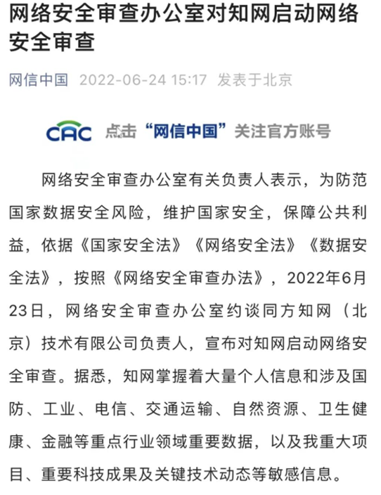 央视新闻6月24日消息,网络安全审查办公室有关负责人表示,为防范国家数据安全风险,维护国家安全,保障公共利益,依据《国家安全法》《网络安全法》《数据安全法》,按照《网络安全审查办法》,2022年6月23日,网络安全审查办公室约谈同方知网(北京)技术有限公司负责人,宣布对知网启动网络安全审查。