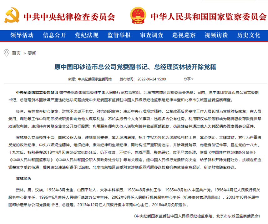 中央纪委国家监委网站6月24日通报,据中央纪委国家监委驻中国人民银行纪检监察组、北京市东城区监察委员会消息:日前,原中国印钞造币总公司党委副书记、总经理贺林因涉嫌严重违纪违法问题接受中央纪委国家监委驻中国人民银行纪检监察组纪律审查和北京市东城区监委监察调查。