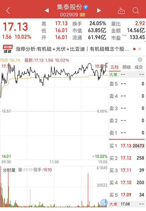 在市场目前最高连续涨停的集泰股份带领下,光伏板块今天全天表现活跃。个股上,金刚玻璃20%涨停,京山轻机、洛阳玻璃、鹿山新材等近20只个股涨停。