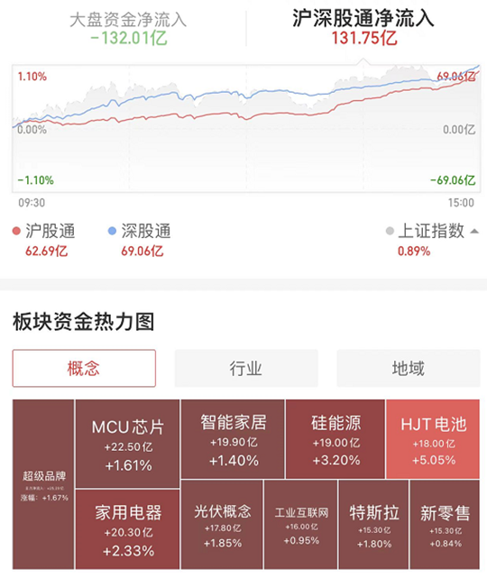 总体上个股普涨,两市近3000只个股上涨。板块方面,HJT电池、旅游景点、塑料等板块涨幅居前,地产、水运、石油开采等板块跌幅居前。成交额方面,沪深两市今日成交11603亿元。北向资金方面,今天北向资金净流入131.75亿元。
