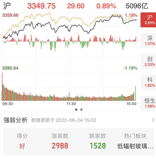 6月24日,大盘全天震荡上涨,创业板指领涨。截至收盘,沪指涨0.89%,深成指涨1.37%,创业板指涨2.33%。