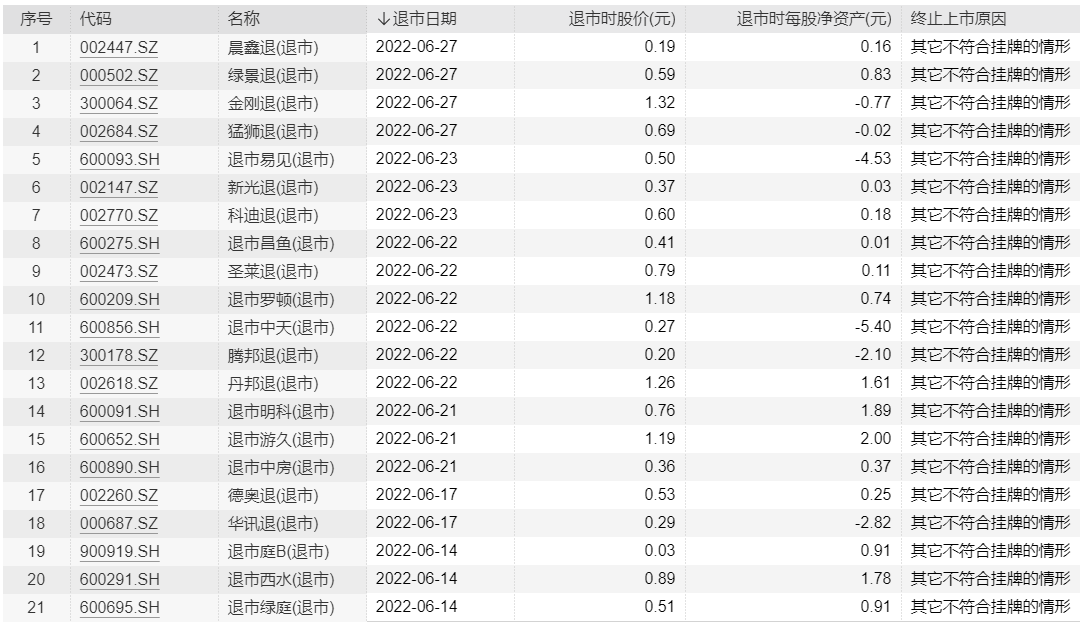 随着上述4家公司集体退市,6月份以来,已有20家公司被强制退市。2021年年报收官以来,沪、深交易所退市节奏不断加快,累计已有40家公司收到交易所终止上市决定书。
