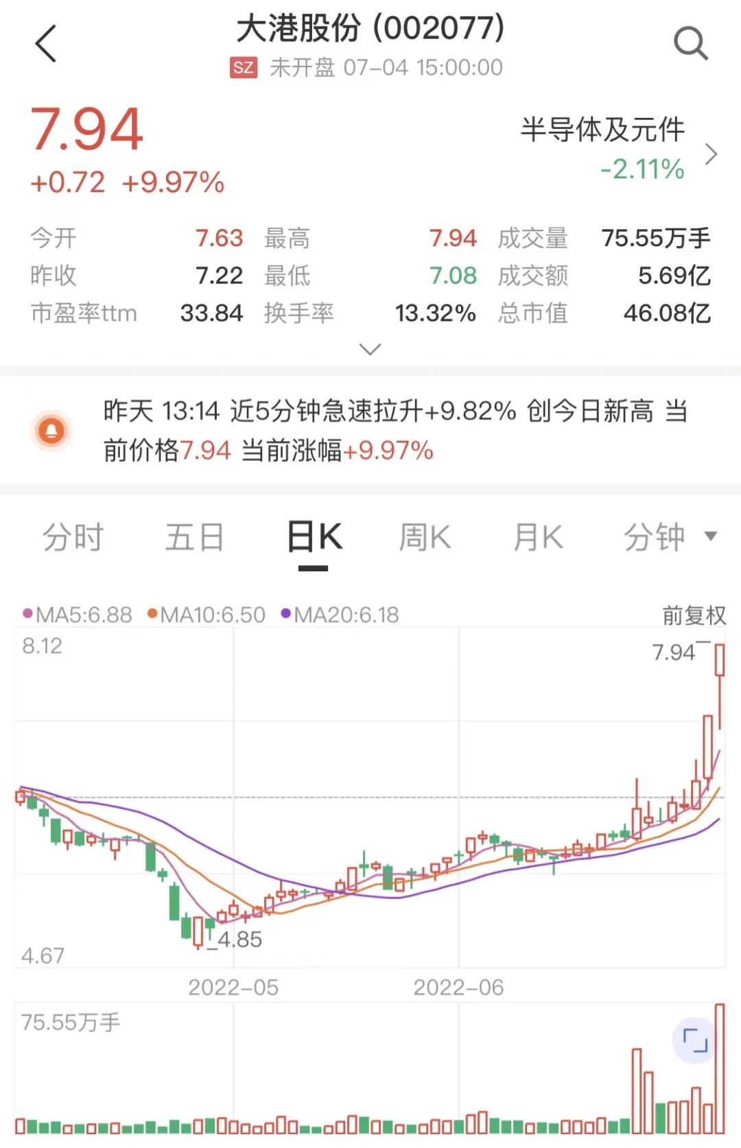 7月4日,大港股份再度直线涨停,最终报7.94元/股,全天成交5.69亿元,最新市值46.08亿元。截至收盘,涨停板上仍有约11.47万手买单。自4月底跌至4.85元低点后,近期大港股份一路走高,累计涨幅约64%。