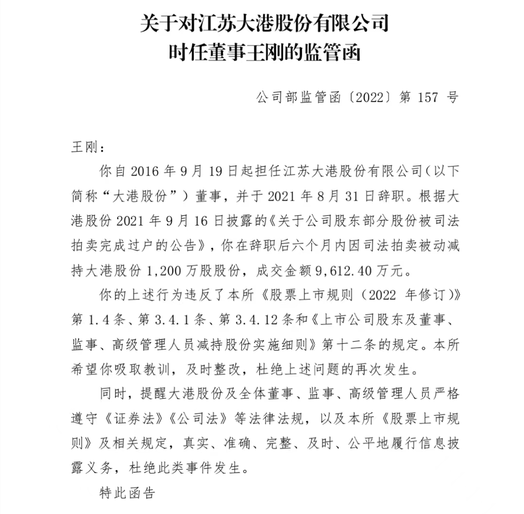 当晚,大港股份还发布公告称,因违规被动减持,公司时任董事王刚于7月4日收到深交所监管函。