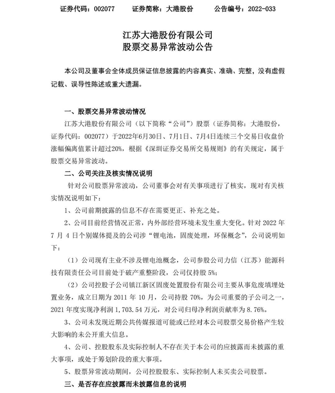 针对个别媒体提及的公司涉及“锂电池、固废处理和环保概念”,大港股份在公告中表示,公司目前经营情况正常,内外部经营环境未发生重大变化。现有主业不涉及锂电池概念,参股公司力信(江苏)能源科技有限责任公司目前处于破产重整阶段,公司仅持股5%。