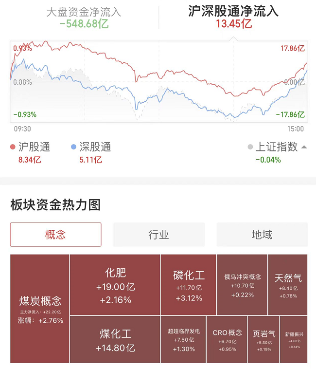 总体上,个股普跌,两市近3400只个股下跌。成交额方面,两市成交11810亿元。板块方面,钒电池、煤炭、磷化工等板块涨幅居前,建材、日用化工、酒店餐饮等板块跌幅居前。北向资金全天净卖出13.48亿元;其中沪股通净卖出3.79亿元,深股通净卖出9.69亿元。